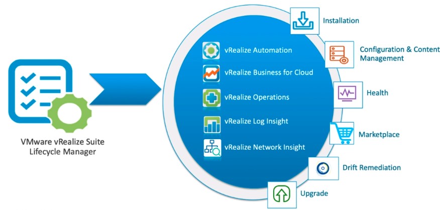 O vRealize Suite Lifecycle Manager automatiza a instalação, configuração, atualização, patches, gerenciamento de configuração, correção de bugs de dentro de um único painel centralizado. Isso fornece aos gerentes de TI ou aos recursos de administrador da nuvem o foco em iniciativas críticas aos negócios e executar drift analysis e visualizar a saúde desses ambientes.