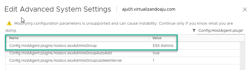 Você pode especificar qualquer grupo do AD que desejar, desde que altere a configuração avançada Config.HostAgent.plugins.hostsvc.esxAdminsGroup, como mostra a Figura 3.