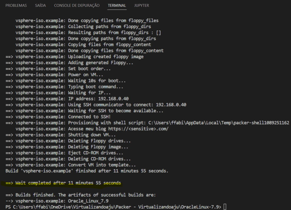 It’s time to run the command: packer build -var-file .vsphere_segredo.pkrvars.hcl -var-file .vsphere.pkrvars.hcl .OracleLinux-7.9.pkr.hcl