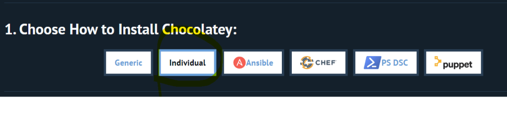 Vamos começar instalando o chocolatey usando os passos do site oficial do Chocolatey. Escolha a opção individual para instalar usando powershell.