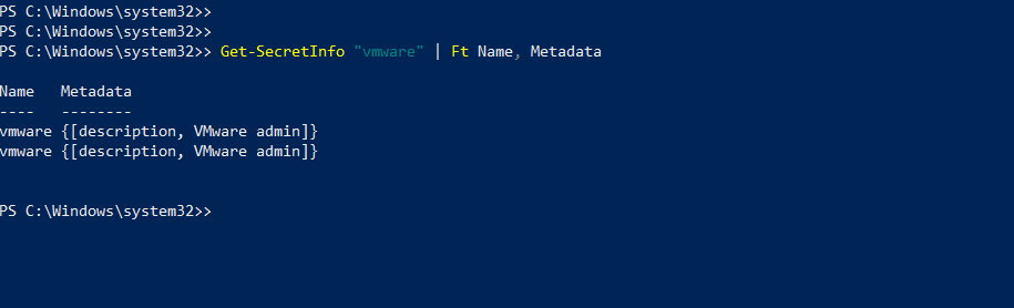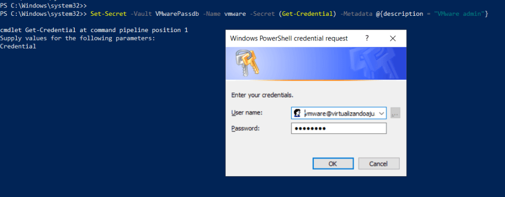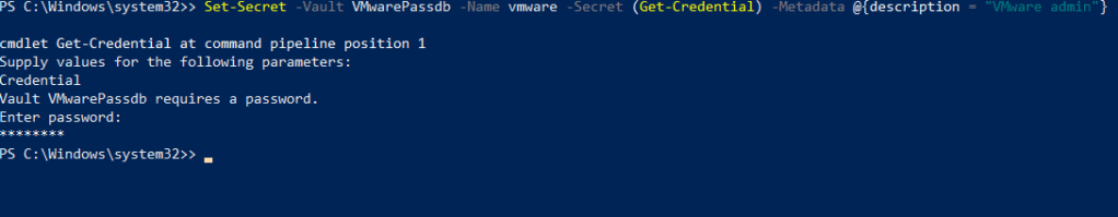 Set-Secret -Vault VMwarePassdb -Name vmware -Secret (Get-Credential) -Metadata @{description = “VMware admin”}