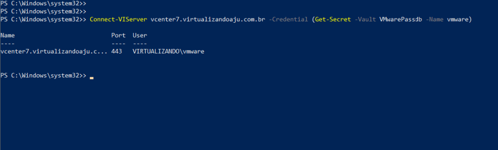 Depois de tudo configurado, qualquer script PowerCLI que você dseje usar, deverá conter o parâmetro -Credential seguido de (Get-secret -Vault “nomecofredb” -name “entrada cadastrada no cofre local”