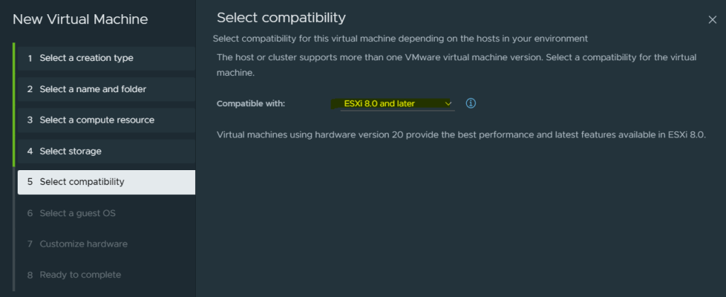 Se a criação de VMs ainda é feita manualmente, você pode definir a compatibilidade padrão para criação de máquina virtual no host, cluster ou datacenter. Essas opções garantem que, quando as máquinas virtuais forem adicionadas a um ambiente vSphere existente, elas sejam compatíveis com as versões de host que residem lá. Basicamente a primeira opção de compatibiliadde sugerida será a que for definida, no entanto, não será uma obrigação durante a criação da VM.