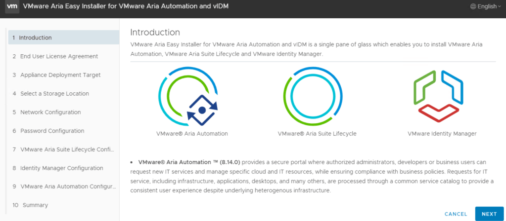 Como sempre, o processo de instalação começa com o download do software necessário nas seções de download do VMware. O ARIA Automation fornece uma ferramenta de instalação: o Easy Installer. O Easy Installer implantará primeiro o Aria LCM Appliance, fará upload dos OVAs do Identity Manager e do dispositivo ARIA Automation para o Aria LCM Appliance e, finalmente, implantará e configurará o último componente.