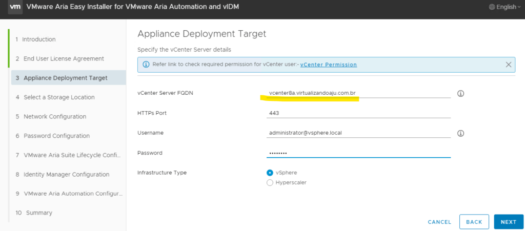 Na próxima etapa, precisamos estabelecer uma conexão com o vCenter. Forneça as seguintes configurações e clique em Next: