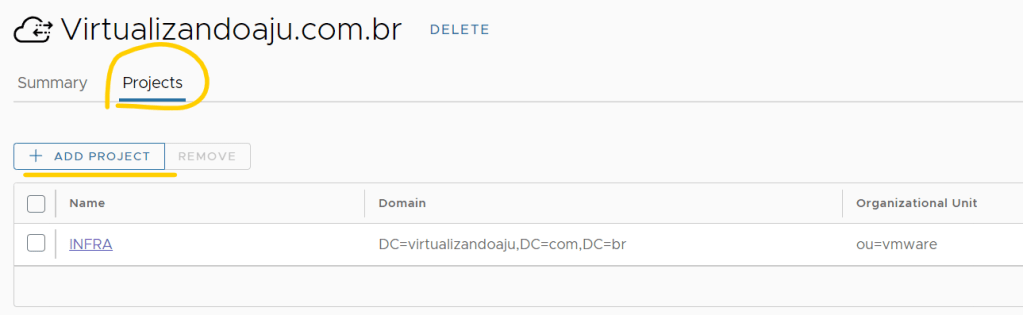 Agora que você tem a conexão com o Active Directory, você pode configurar o Cloud Assembler para preparar os objetos de máquina no Active Directory na UO específica especificada na configuração. Para configurar a unidade organizacional de um projeto, selecione a integração que você acabou de criar, selecione a guia Projetos e clique no botão ADICIONAR PROJETO:
