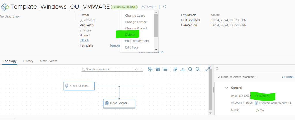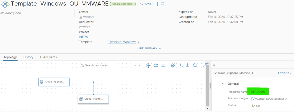 Agora que tudo está configurado, você pode implantar uma máquina a partir de um dos blueprints no Cloud Assembler e verá que o objeto da máquina está pré-preparado na UO que você especificou.
