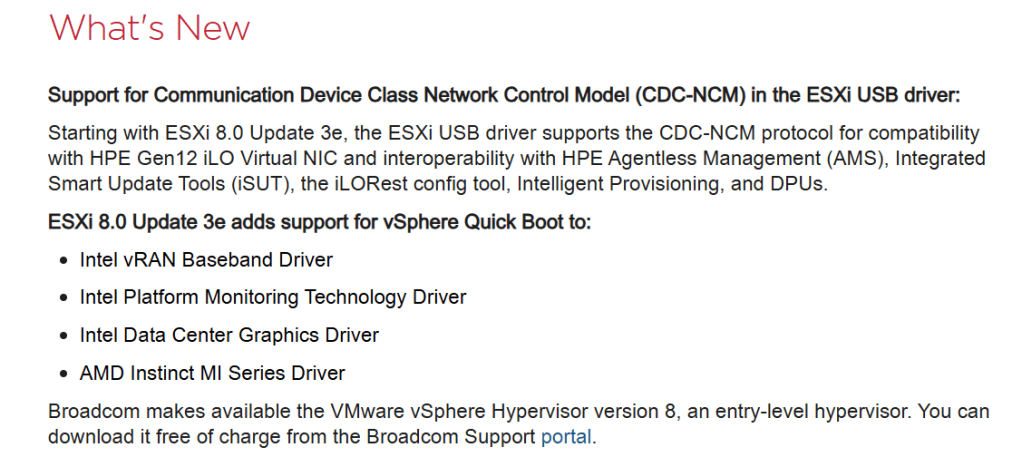 Bem, isso pode ter passado despercebido, mas na página de notas de versão do VMware 8.0U3e, você verá esta sinopse nas notas de versão oficiais do VMware 8.0 U3e: Notas de versão do VMware ESXi 8.0 Update 3e.