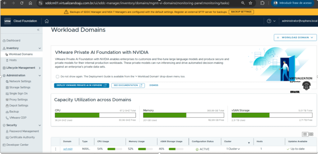 Após a instalação, o VMware Cloud Foundation apresenta este painel, de onde você realiza o gerenciamento do ambiente e a criação de Workload Domains. Publicaremos outros posts explicando, em detalhes, cada conjunto de opções e fluxos de operação.